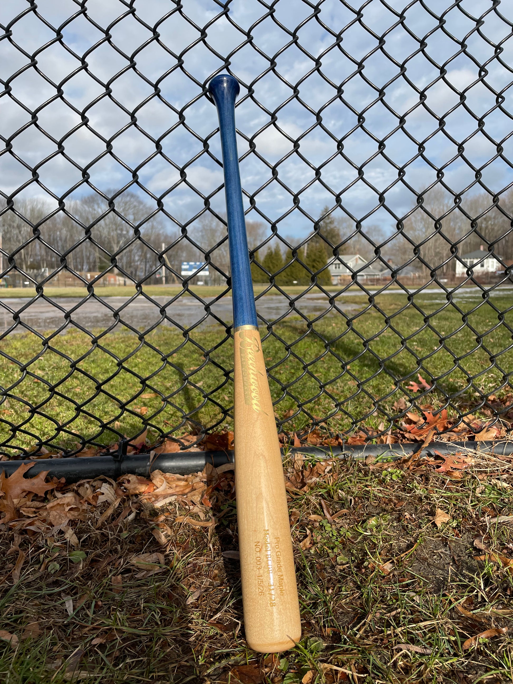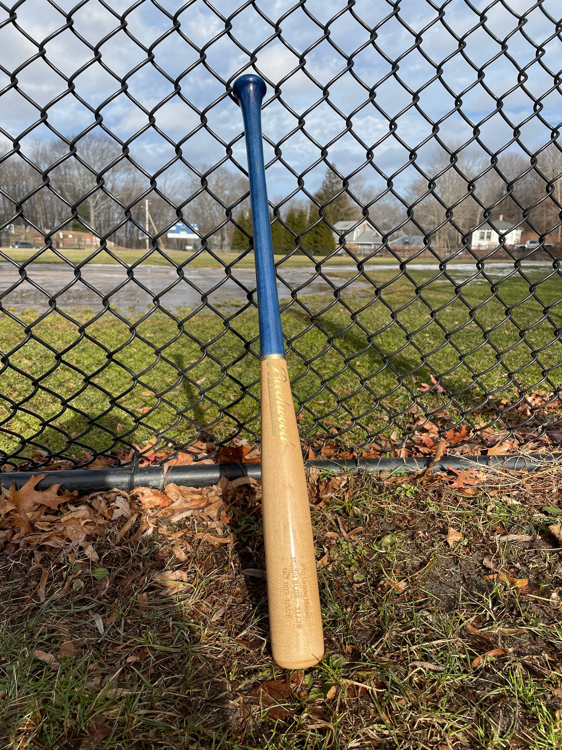 This bat is a -3 BC08 model, with a gloss blue stained handle finish. It’s made with professional grade maple featuring a fiber compressed barrel for maximum wood density.